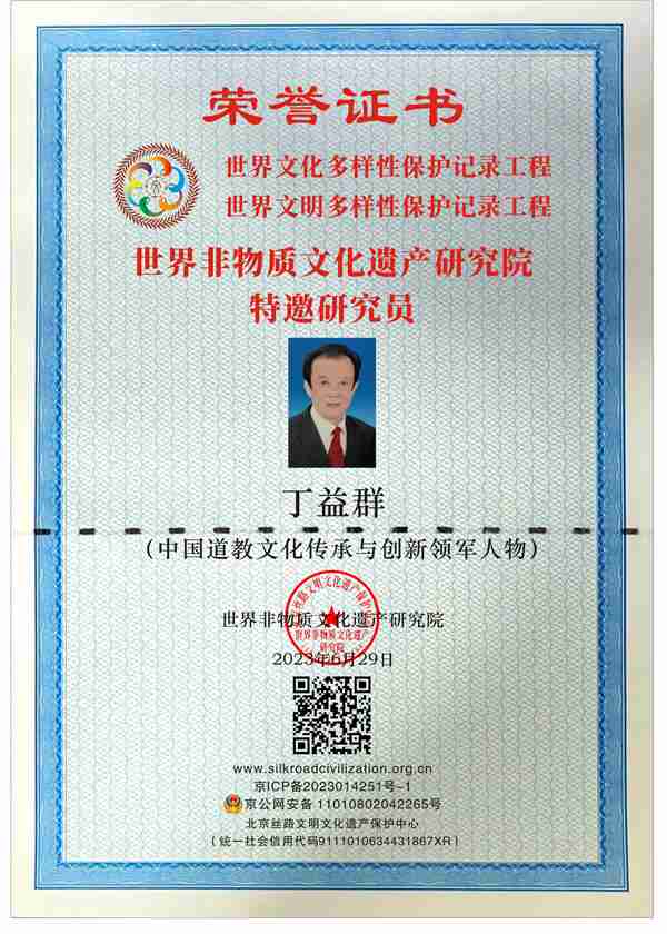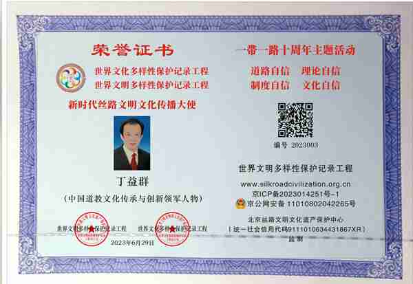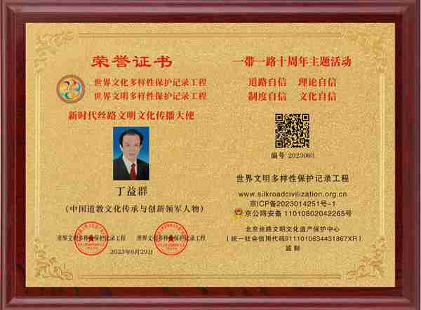 新时代非遗文化传播大使、中国道教文化传承与创新领军人物、新时代新成就国家记忆工程大国工匠、纪念改革开放45周年特别活动(中华好手艺)、中华之光年度人物评委会委员、当代易学名家。