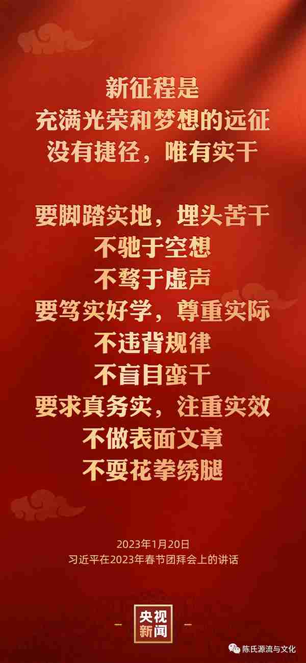 上说“大道至简,实干为要。新征程是充满光荣和梦想的远征,没有捷径,唯有实干。我们靠实干创造了辉煌的过去,还要靠实干开创更加美好的未来。”癸卯兔年伊始,让我们高举联谊会“弘扬陈氏源流文化,再创义门家族辉煌”的旗帜,紧密团结在联谊会班子周围,以敢为人先的信心,开拓创新的气魄,策马加鞭,风雨同舟,携手并进;始终不渝地加强与全国各地陈氏组织机构的联络,加强陈氏源流文化与人文精神的交流与合作;努力把联谊会办成陈氏宗亲的温馨家园、联系宗亲的纽带与桥梁及促进社会和谐发展的平台与舞台。
